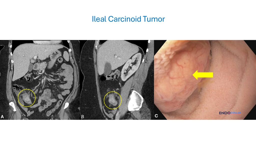 Conclusion: This case highlights the importance of cross-sectional imaging in the incidental discovery of ileal neuroendocrine tumors and the characteristic endoscopic features — yellowish color, firm consistency, polypoid morphology — that should raise suspicion for carcinoid. Early identification is critical given the risk of metastasis and carcinoid syndrome.