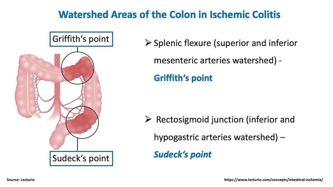 Key elements though are sparing of the rectum and segmental distribution, mainly in the left colon (at the watershed area, arc of Riolan). These are called Sudeck’s and Griffith’s points or areas (Figure 4).